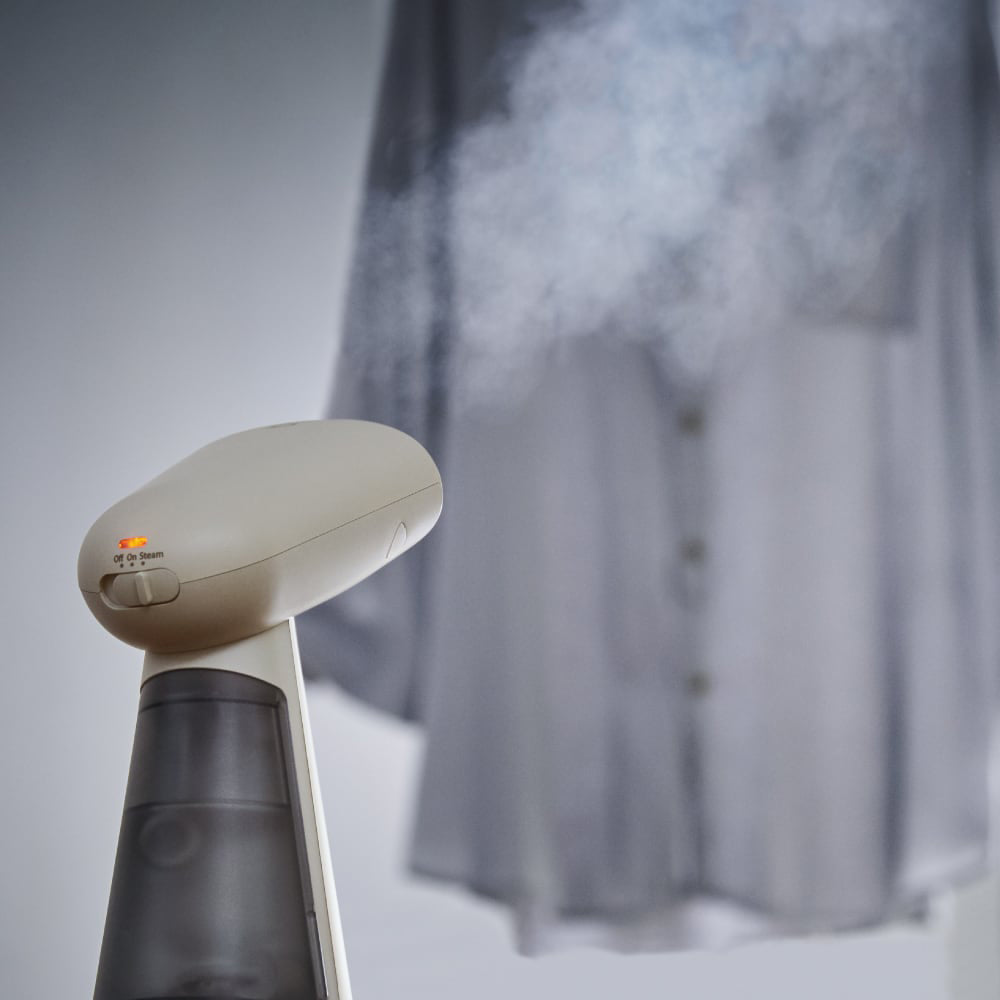 高温スチームの力で、衣類のシワやヨレをのばしてキレイに。電源を入れてから約25秒というスピーディーな立ち上がりだから、お出かけ前や帰宅後の忙しい時間にも、ハンガーにかけたまま手軽にお手入れ。気になった時にすぐに手に取れるよう、細かな使い勝手にまでこだわりました。全体のお手入れはスチームアイロンで、袖や襟などの細かい部分はプレスアイロンで仕上げることもできます。