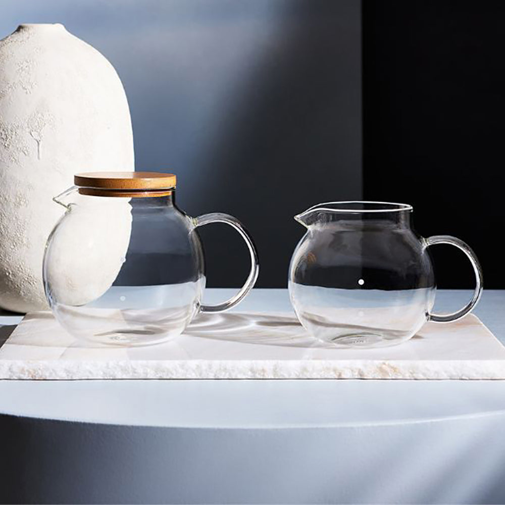 ハンドメイドのガラスとバンブーのフタを組み合わせたガラスサーバーは、温かみと清潔感のあるデザインで、インテリア感覚でも愉しめます。フタを外した状態であれば、電子レンジ・食器洗浄機・食器乾燥機でのご使用が可能です。