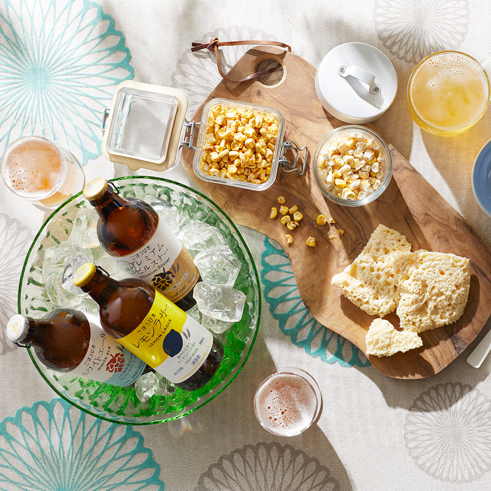 瀬戸内レモン果汁を使用したレモンラガー、華やかな香りが特徴の薄にごりタイプのホワイトエール、オーガニックホップを使用したキレのあるプレミアムピルスナーのセットと北海道のこだわりおつまみ。